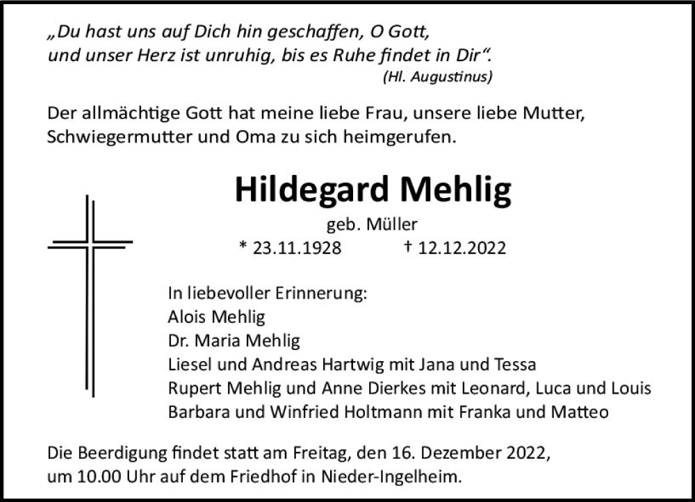 Hier finden Sie alle Traueranzeigen aus der Zeitung, die bisher für Hildegard Mehlig erschienen sind. Weitere Traueranzeigen, die in der Zeitung erscheinen, werden hier ebenfalls aufgelistet
