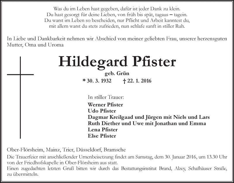 Hier finden Sie alle Traueranzeigen aus der Zeitung, die bisher für Hildegard Pfister erschienen sind. Weitere Traueranzeigen, die in der Zeitung erscheinen, werden hier ebenfalls aufgelistet