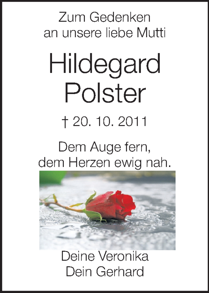 Hier finden Sie alle Traueranzeigen aus der Zeitung, die bisher für Hildegard Polster erschienen sind. Weitere Traueranzeigen, die in der Zeitung erscheinen, werden hier ebenfalls aufgelistet