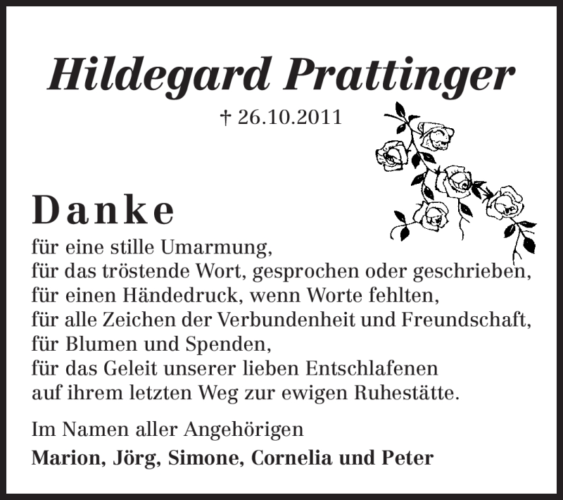 Hier finden Sie alle Traueranzeigen aus der Zeitung, die bisher für Hildegard Prattinger erschienen sind. Weitere Traueranzeigen, die in der Zeitung erscheinen, werden hier ebenfalls aufgelistet