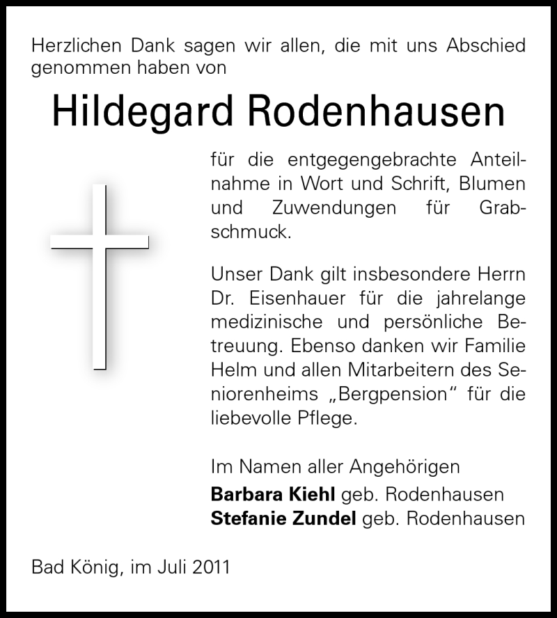 Hier finden Sie alle Traueranzeigen aus der Zeitung, die bisher für Hildegard Rodenhausen erschienen sind. Weitere Traueranzeigen, die in der Zeitung erscheinen, werden hier ebenfalls aufgelistet