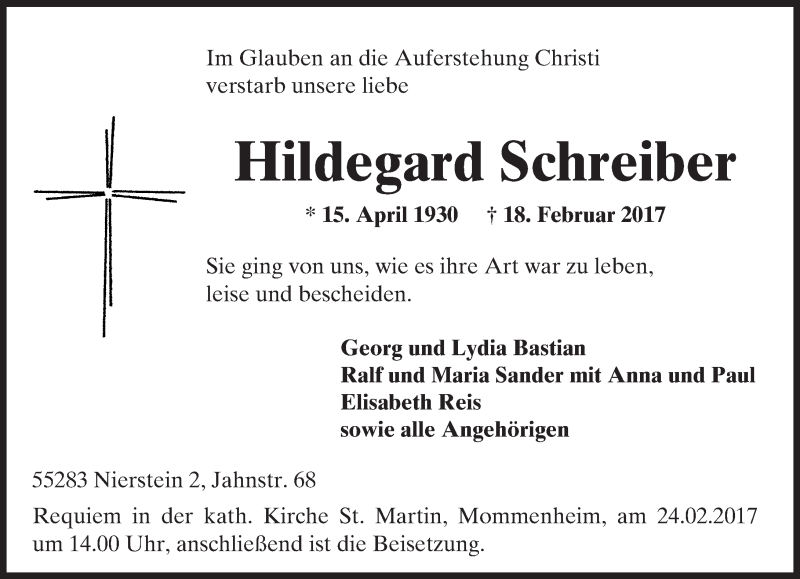 Hier finden Sie alle Traueranzeigen aus der Zeitung, die bisher für Hildegard Schreiber erschienen sind. Weitere Traueranzeigen, die in der Zeitung erscheinen, werden hier ebenfalls aufgelistet