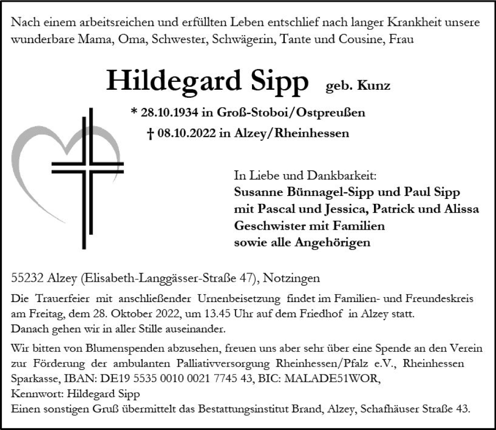 Hier finden Sie alle Traueranzeigen aus der Zeitung, die bisher für Hildegard Sipp erschienen sind. Weitere Traueranzeigen, die in der Zeitung erscheinen, werden hier ebenfalls aufgelistet