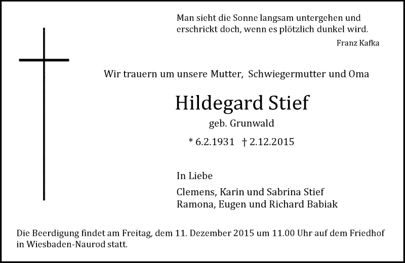 Hier finden Sie alle Traueranzeigen aus der Zeitung, die bisher für Hildegard Stief erschienen sind. Weitere Traueranzeigen, die in der Zeitung erscheinen, werden hier ebenfalls aufgelistet