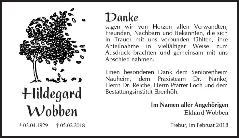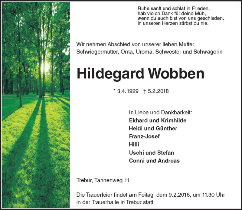Hier finden Sie alle Traueranzeigen aus der Zeitung, die bisher für Hildegard Wobben erschienen sind. Weitere Traueranzeigen, die in der Zeitung erscheinen, werden hier ebenfalls aufgelistet
