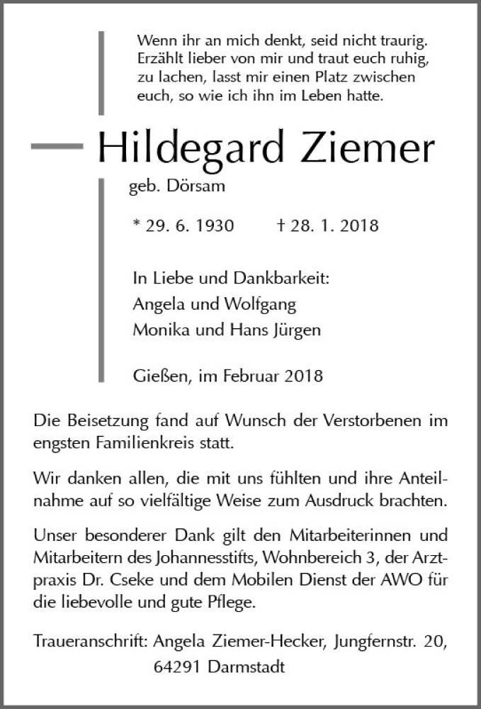 Hier finden Sie alle Traueranzeigen aus der Zeitung, die bisher für Hildegard Ziemer erschienen sind. Weitere Traueranzeigen, die in der Zeitung erscheinen, werden hier ebenfalls aufgelistet