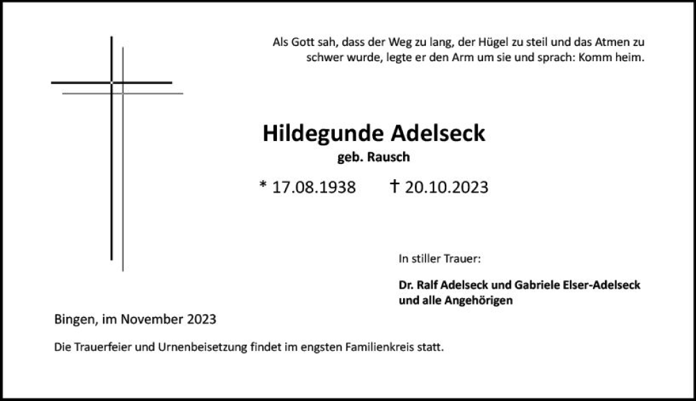 Hier finden Sie alle Traueranzeigen aus der Zeitung, die bisher für Hildegunde Adelseck erschienen sind. Weitere Traueranzeigen, die in der Zeitung erscheinen, werden hier ebenfalls aufgelistet