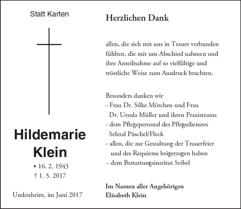 Hier finden Sie alle Traueranzeigen aus der Zeitung, die bisher für Hildemarie Klein erschienen sind. Weitere Traueranzeigen, die in der Zeitung erscheinen, werden hier ebenfalls aufgelistet
