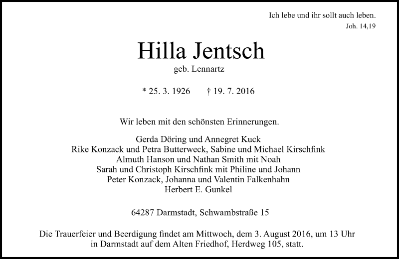 Hier finden Sie alle Traueranzeigen aus der Zeitung, die bisher für Hilla Jentsch erschienen sind. Weitere Traueranzeigen, die in der Zeitung erscheinen, werden hier ebenfalls aufgelistet