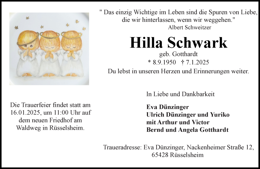 Hier finden Sie alle Traueranzeigen aus der Zeitung, die bisher für Hilla Schwark erschienen sind. Weitere Traueranzeigen, die in der Zeitung erscheinen, werden hier ebenfalls aufgelistet