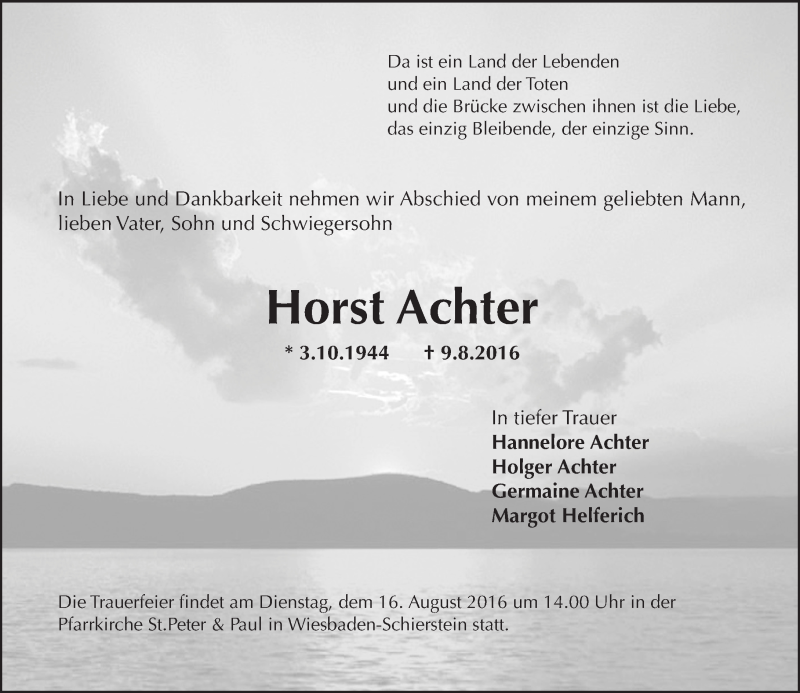 Hier finden Sie alle Traueranzeigen aus der Zeitung, die bisher für Horst Achter erschienen sind. Weitere Traueranzeigen, die in der Zeitung erscheinen, werden hier ebenfalls aufgelistet