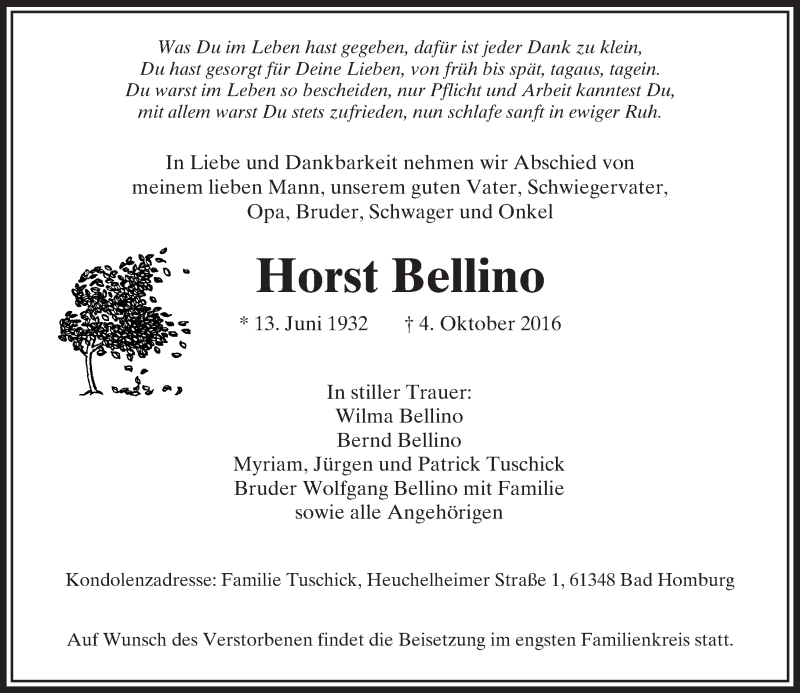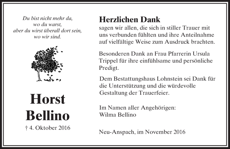 Hier finden Sie alle Traueranzeigen aus der Zeitung, die bisher für Horst Bellino erschienen sind. Weitere Traueranzeigen, die in der Zeitung erscheinen, werden hier ebenfalls aufgelistet