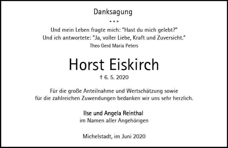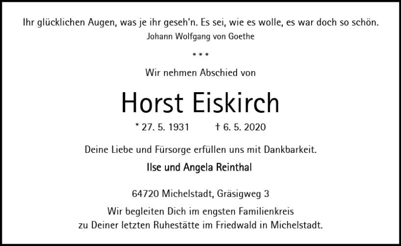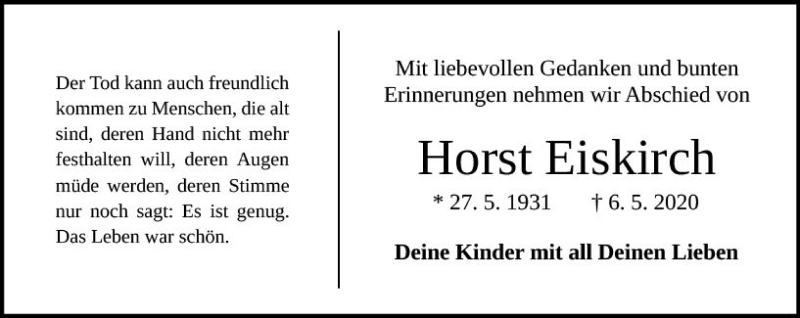 Hier finden Sie alle Traueranzeigen aus der Zeitung, die bisher für Horst Eiskirch erschienen sind. Weitere Traueranzeigen, die in der Zeitung erscheinen, werden hier ebenfalls aufgelistet