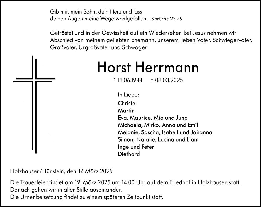 Hier finden Sie alle Traueranzeigen aus der Zeitung, die bisher für Horst Herrmann erschienen sind. Weitere Traueranzeigen, die in der Zeitung erscheinen, werden hier ebenfalls aufgelistet