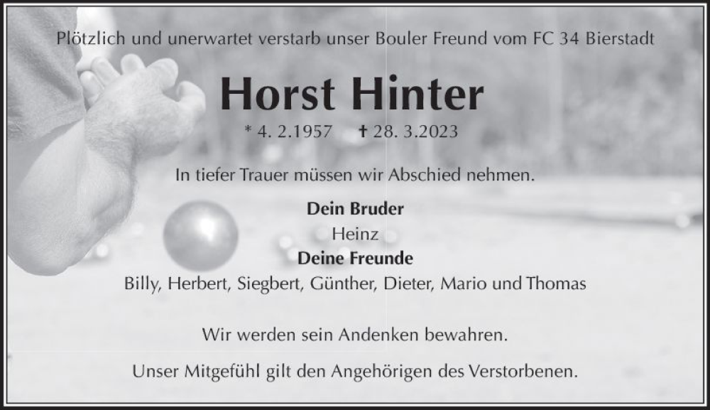 Hier finden Sie alle Traueranzeigen aus der Zeitung, die bisher für Horst Hinter erschienen sind. Weitere Traueranzeigen, die in der Zeitung erscheinen, werden hier ebenfalls aufgelistet
