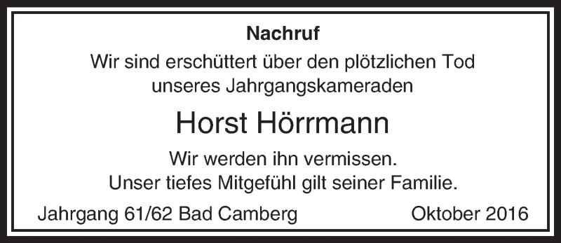 Hier finden Sie alle Traueranzeigen aus der Zeitung, die bisher für Horst Hörrmann erschienen sind. Weitere Traueranzeigen, die in der Zeitung erscheinen, werden hier ebenfalls aufgelistet