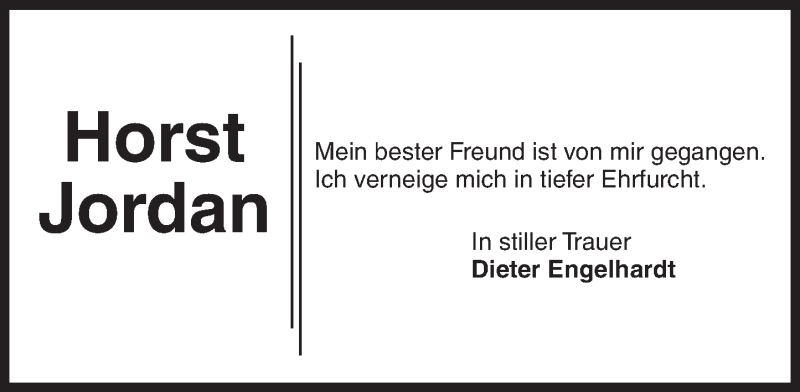 Hier finden Sie alle Traueranzeigen aus der Zeitung, die bisher für Horst Jordan erschienen sind. Weitere Traueranzeigen, die in der Zeitung erscheinen, werden hier ebenfalls aufgelistet