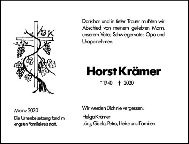 Hier finden Sie alle Traueranzeigen aus der Zeitung, die bisher für Horst Krämer erschienen sind. Weitere Traueranzeigen, die in der Zeitung erscheinen, werden hier ebenfalls aufgelistet