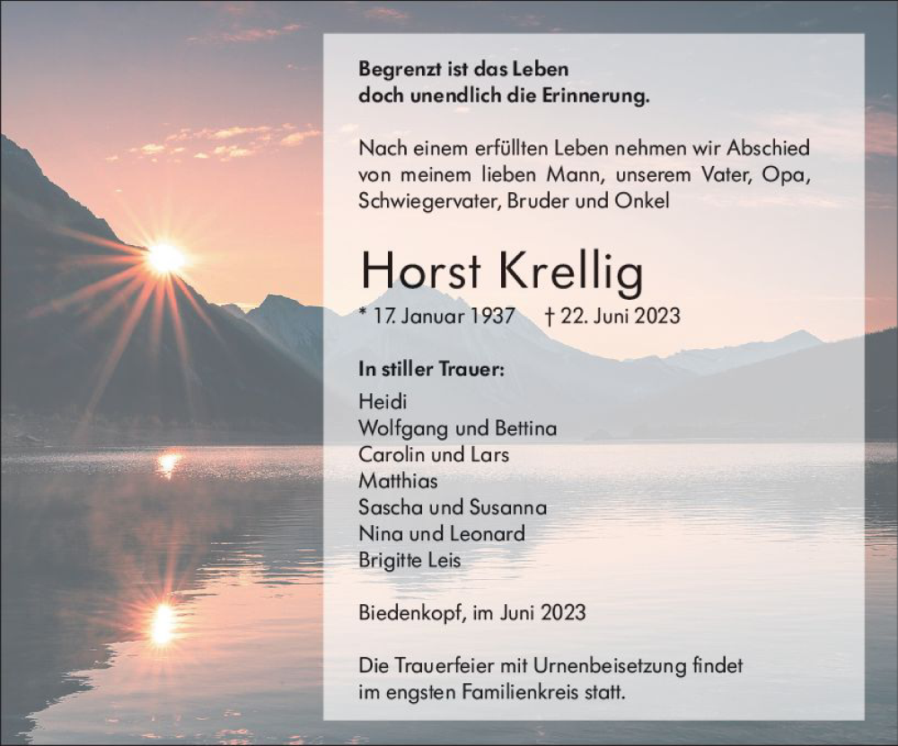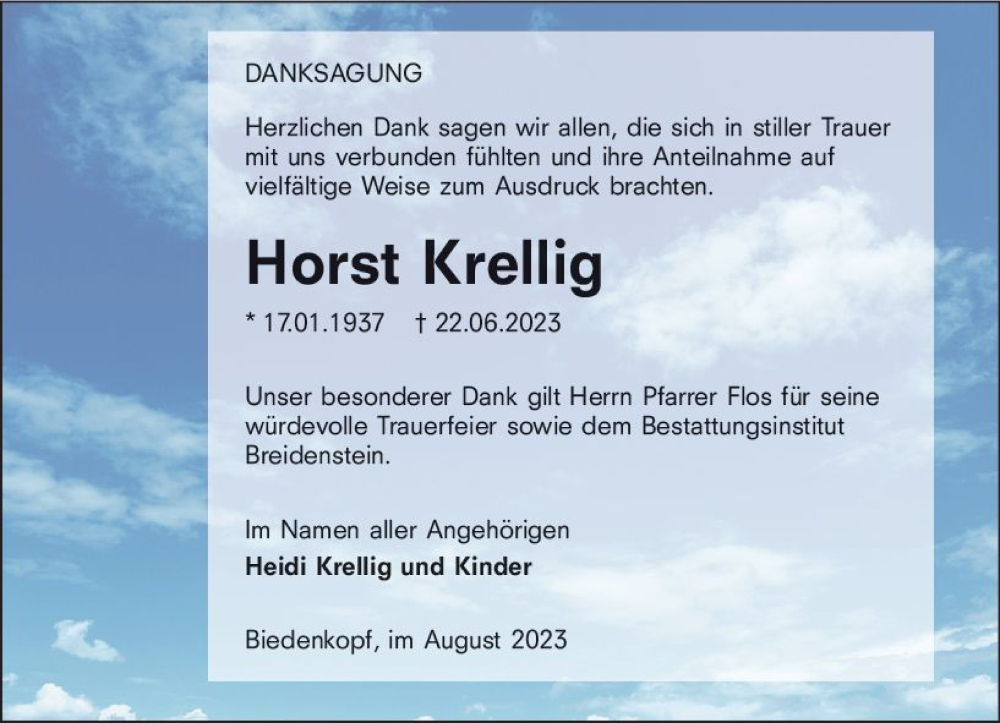 Hier finden Sie alle Traueranzeigen aus der Zeitung, die bisher für Horst Krellig erschienen sind. Weitere Traueranzeigen, die in der Zeitung erscheinen, werden hier ebenfalls aufgelistet