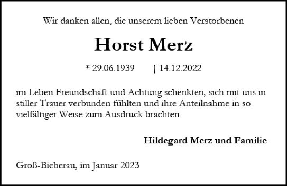 Hier finden Sie alle Traueranzeigen aus der Zeitung, die bisher für Horst Merz erschienen sind. Weitere Traueranzeigen, die in der Zeitung erscheinen, werden hier ebenfalls aufgelistet