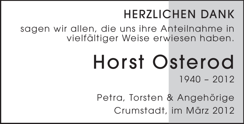 Hier finden Sie alle Traueranzeigen aus der Zeitung, die bisher für Horst Osterod erschienen sind. Weitere Traueranzeigen, die in der Zeitung erscheinen, werden hier ebenfalls aufgelistet