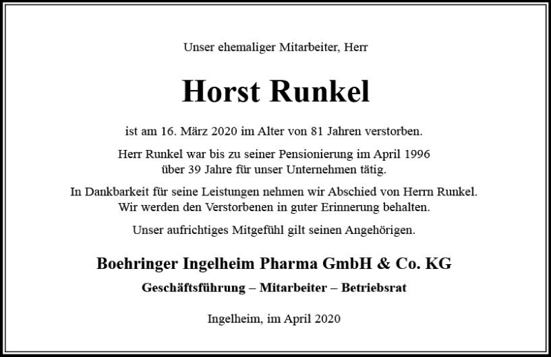 Hier finden Sie alle Traueranzeigen aus der Zeitung, die bisher für Horst Runkel erschienen sind. Weitere Traueranzeigen, die in der Zeitung erscheinen, werden hier ebenfalls aufgelistet