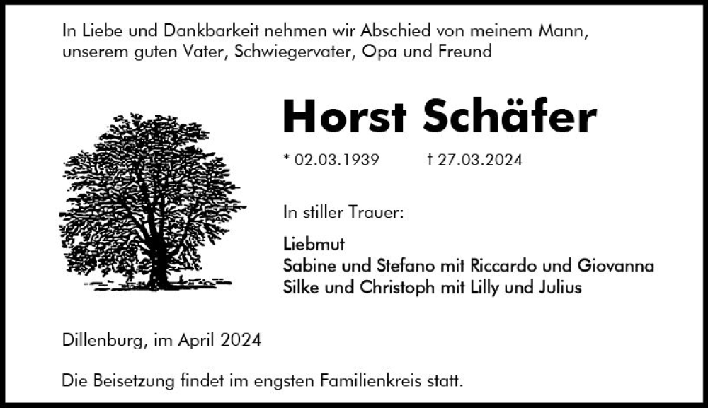 Hier finden Sie alle Traueranzeigen aus der Zeitung, die bisher für Horst Schäfer erschienen sind. Weitere Traueranzeigen, die in der Zeitung erscheinen, werden hier ebenfalls aufgelistet