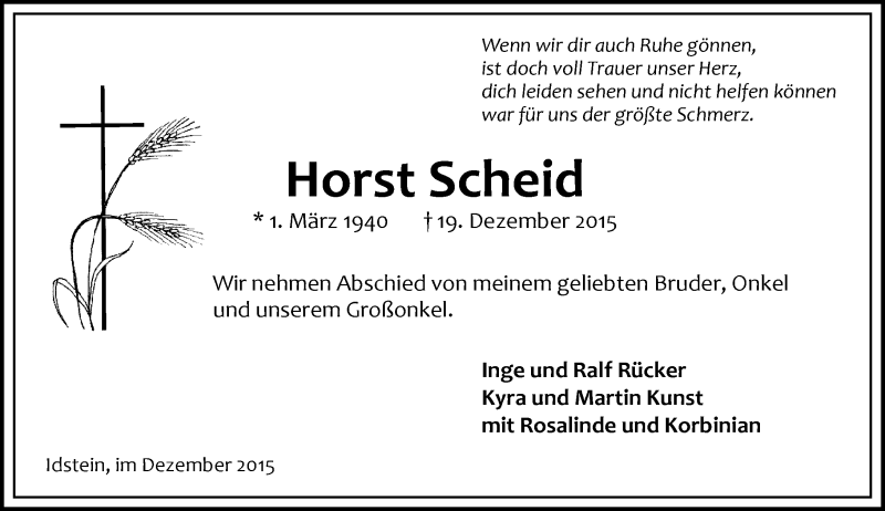 Hier finden Sie alle Traueranzeigen aus der Zeitung, die bisher für Horst Scheid erschienen sind. Weitere Traueranzeigen, die in der Zeitung erscheinen, werden hier ebenfalls aufgelistet