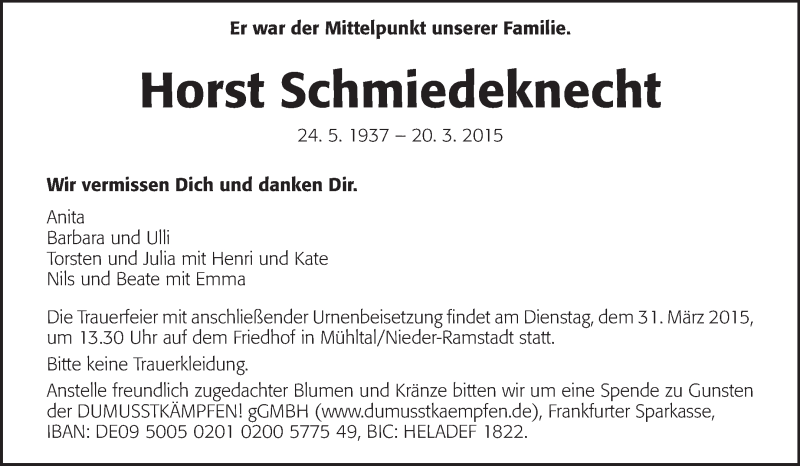 Hier finden Sie alle Traueranzeigen aus der Zeitung, die bisher für Horst Schmiedeknecht erschienen sind. Weitere Traueranzeigen, die in der Zeitung erscheinen, werden hier ebenfalls aufgelistet