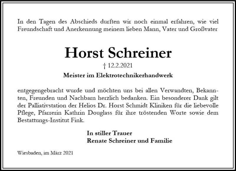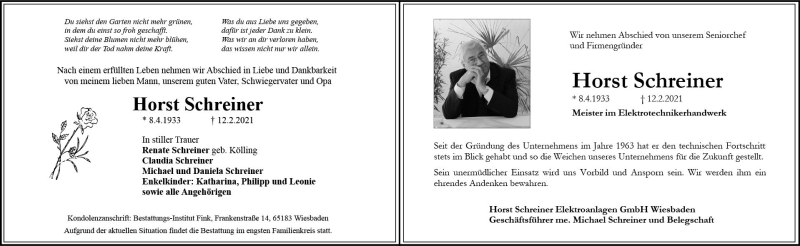 Hier finden Sie alle Traueranzeigen aus der Zeitung, die bisher für Horst Schreiner erschienen sind. Weitere Traueranzeigen, die in der Zeitung erscheinen, werden hier ebenfalls aufgelistet