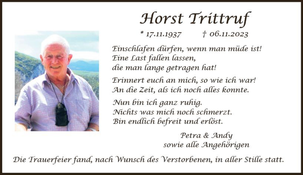 Hier finden Sie alle Traueranzeigen aus der Zeitung, die bisher für Horst Trittruf erschienen sind. Weitere Traueranzeigen, die in der Zeitung erscheinen, werden hier ebenfalls aufgelistet