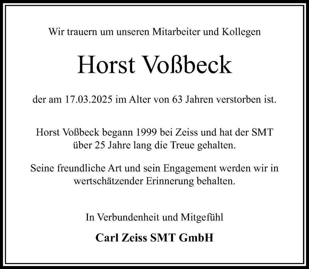 Hier finden Sie alle Traueranzeigen aus der Zeitung, die bisher für Horst Voßbeck erschienen sind. Weitere Traueranzeigen, die in der Zeitung erscheinen, werden hier ebenfalls aufgelistet