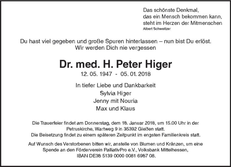 Hier finden Sie alle Traueranzeigen aus der Zeitung, die bisher für H. Peter Higer erschienen sind. Weitere Traueranzeigen, die in der Zeitung erscheinen, werden hier ebenfalls aufgelistet