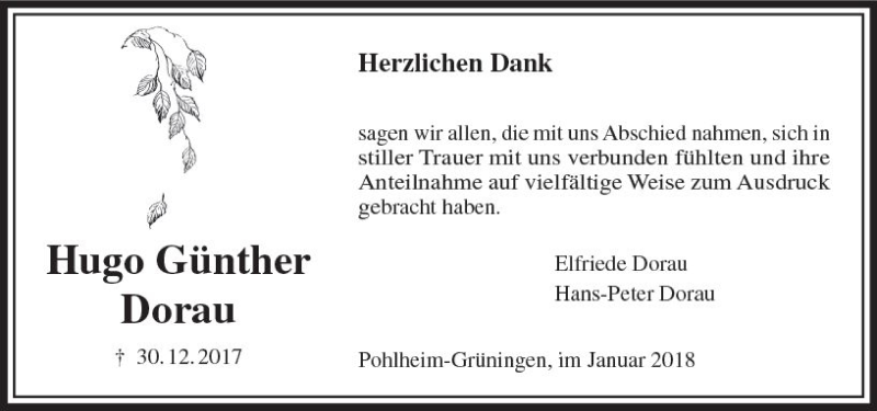 Hier finden Sie alle Traueranzeigen aus der Zeitung, die bisher für Hugo Günther Dorau erschienen sind. Weitere Traueranzeigen, die in der Zeitung erscheinen, werden hier ebenfalls aufgelistet