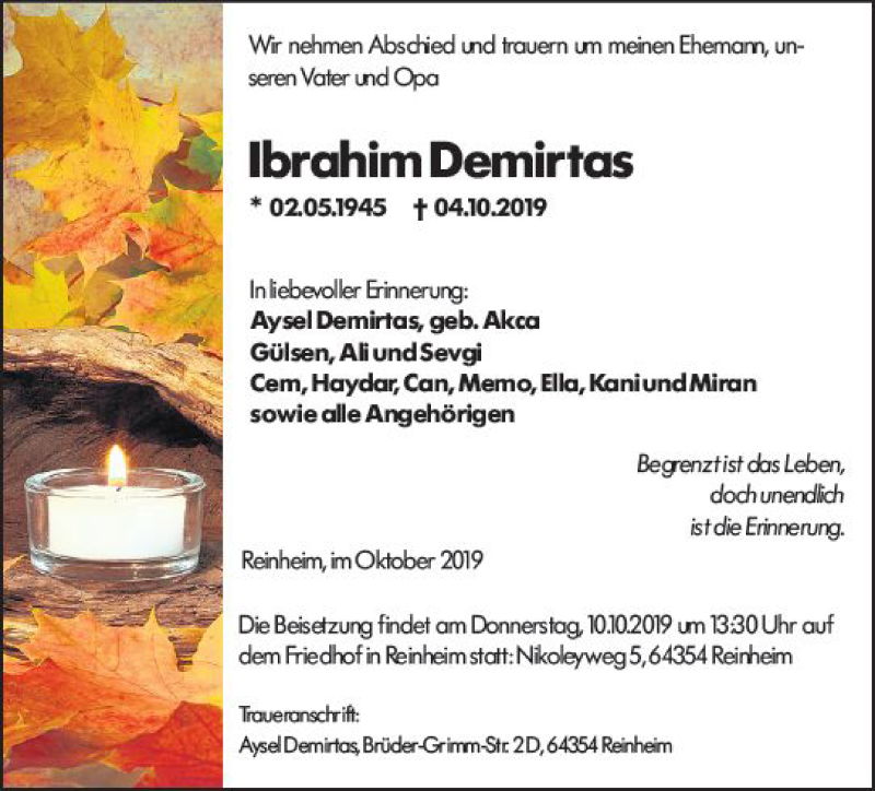 Hier finden Sie alle Traueranzeigen aus der Zeitung, die bisher für Ibrahim Demirtas erschienen sind. Weitere Traueranzeigen, die in der Zeitung erscheinen, werden hier ebenfalls aufgelistet