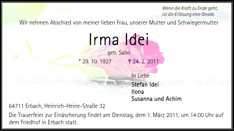 Hier finden Sie alle Traueranzeigen aus der Zeitung, die bisher für Idei Irma erschienen sind. Weitere Traueranzeigen, die in der Zeitung erscheinen, werden hier ebenfalls aufgelistet