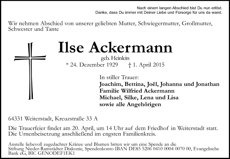 Hier finden Sie alle Traueranzeigen aus der Zeitung, die bisher für Ilse Ackermann erschienen sind. Weitere Traueranzeigen, die in der Zeitung erscheinen, werden hier ebenfalls aufgelistet