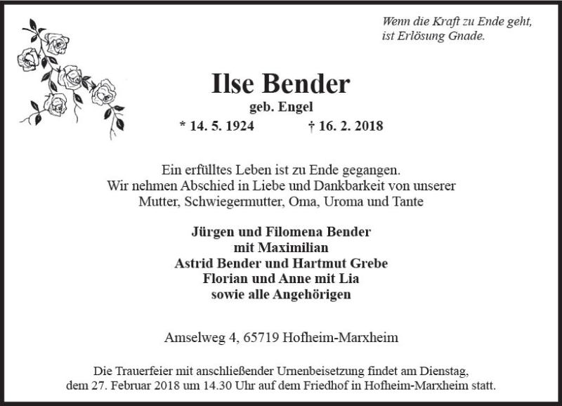 Hier finden Sie alle Traueranzeigen aus der Zeitung, die bisher für Ilse Bender erschienen sind. Weitere Traueranzeigen, die in der Zeitung erscheinen, werden hier ebenfalls aufgelistet