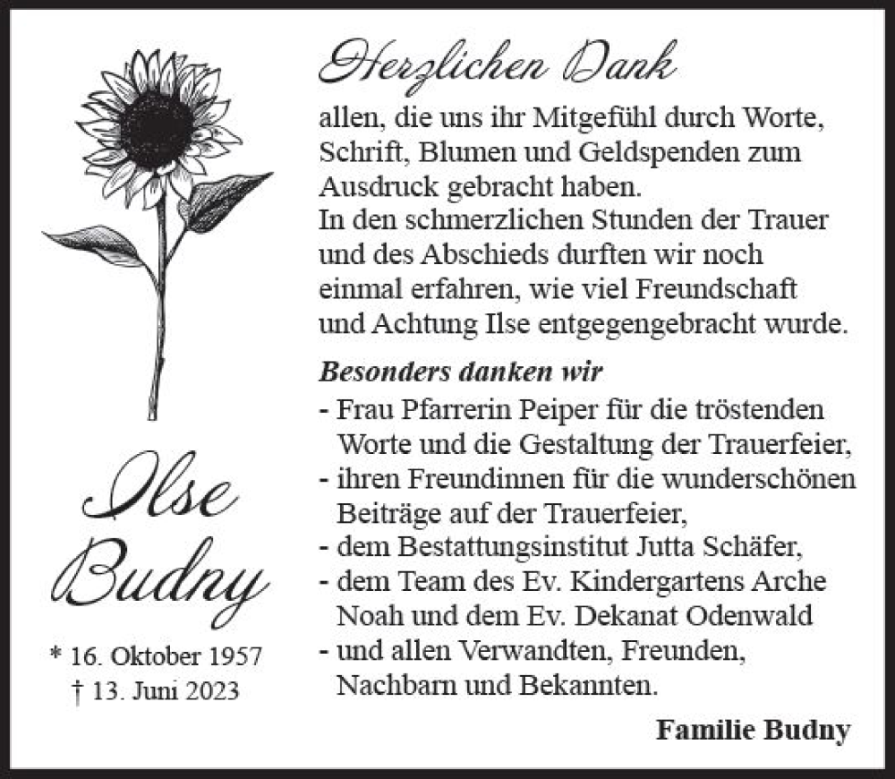 Hier finden Sie alle Traueranzeigen aus der Zeitung, die bisher für Ilse Budny erschienen sind. Weitere Traueranzeigen, die in der Zeitung erscheinen, werden hier ebenfalls aufgelistet