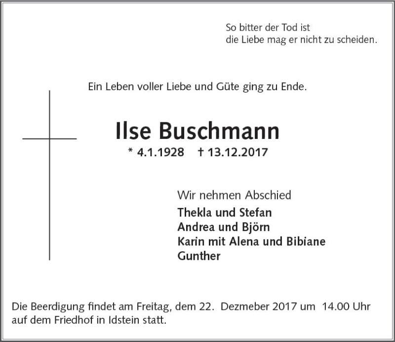 Hier finden Sie alle Traueranzeigen aus der Zeitung, die bisher für Ilse Buschmann erschienen sind. Weitere Traueranzeigen, die in der Zeitung erscheinen, werden hier ebenfalls aufgelistet