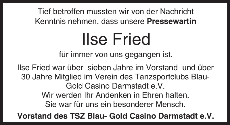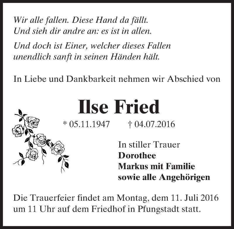 Hier finden Sie alle Traueranzeigen aus der Zeitung, die bisher für Ilse Fried erschienen sind. Weitere Traueranzeigen, die in der Zeitung erscheinen, werden hier ebenfalls aufgelistet
