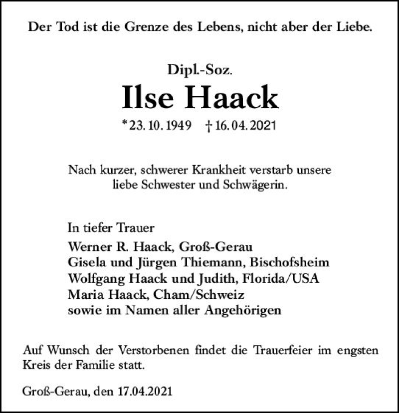 Hier finden Sie alle Traueranzeigen aus der Zeitung, die bisher für Ilse Haack erschienen sind. Weitere Traueranzeigen, die in der Zeitung erscheinen, werden hier ebenfalls aufgelistet