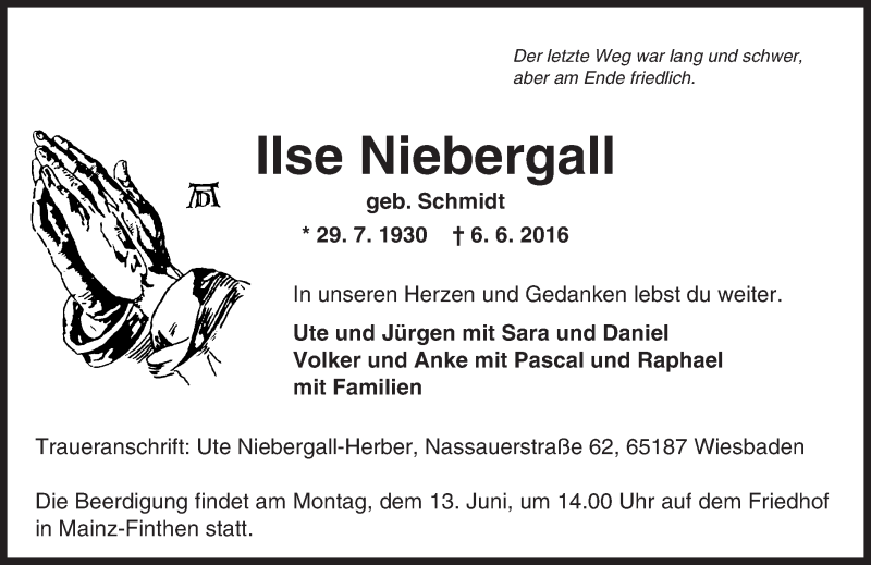 Hier finden Sie alle Traueranzeigen aus der Zeitung, die bisher für Ilse Niebergall erschienen sind. Weitere Traueranzeigen, die in der Zeitung erscheinen, werden hier ebenfalls aufgelistet