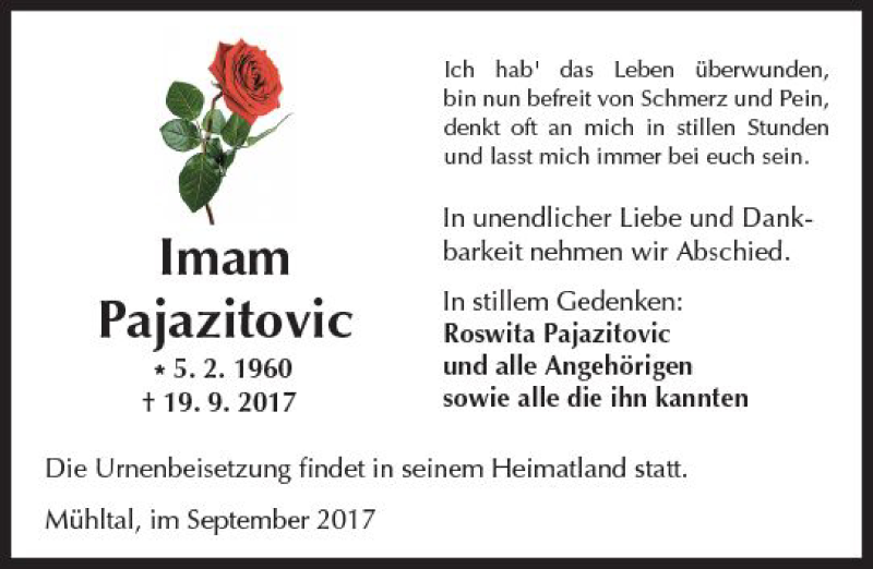Hier finden Sie alle Traueranzeigen aus der Zeitung, die bisher für Imam Pajazitovic erschienen sind. Weitere Traueranzeigen, die in der Zeitung erscheinen, werden hier ebenfalls aufgelistet