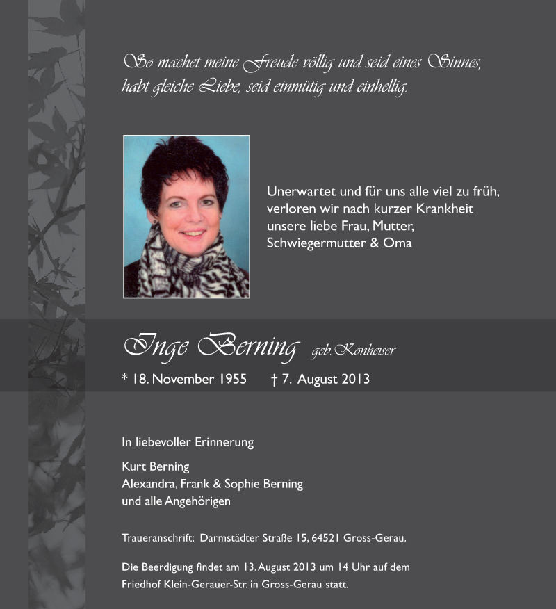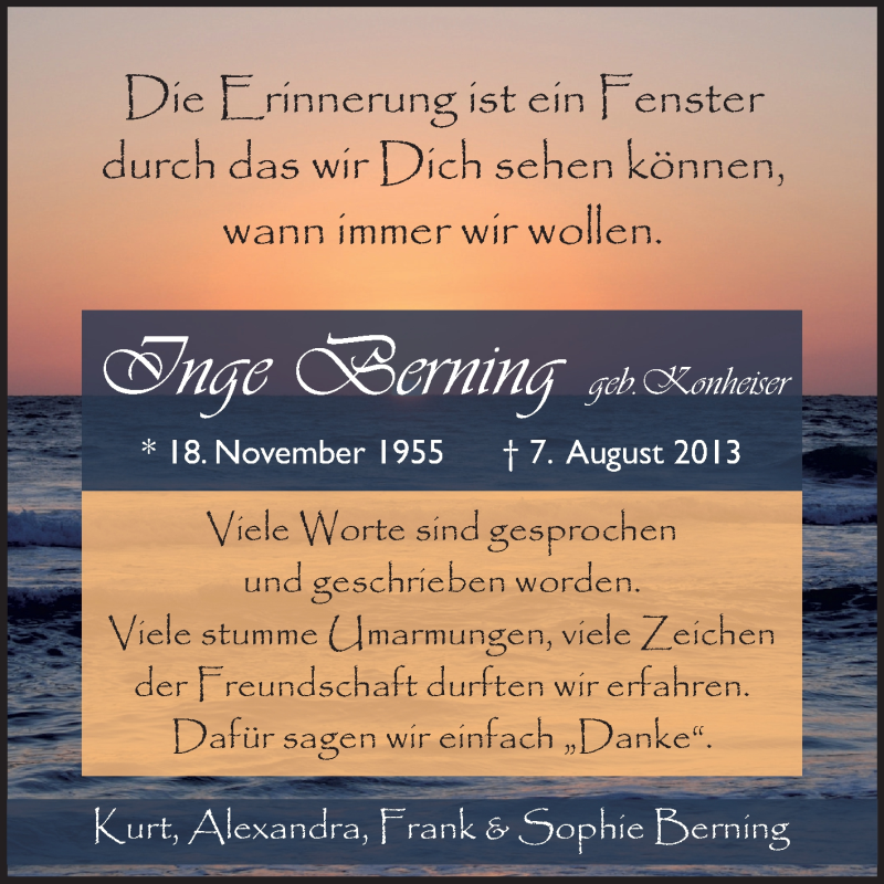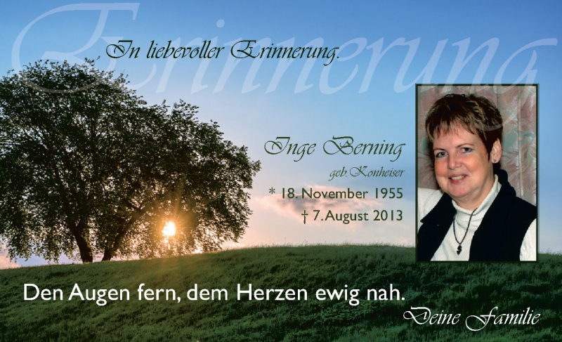 Hier finden Sie alle Traueranzeigen aus der Zeitung, die bisher für Inge Berning erschienen sind. Weitere Traueranzeigen, die in der Zeitung erscheinen, werden hier ebenfalls aufgelistet