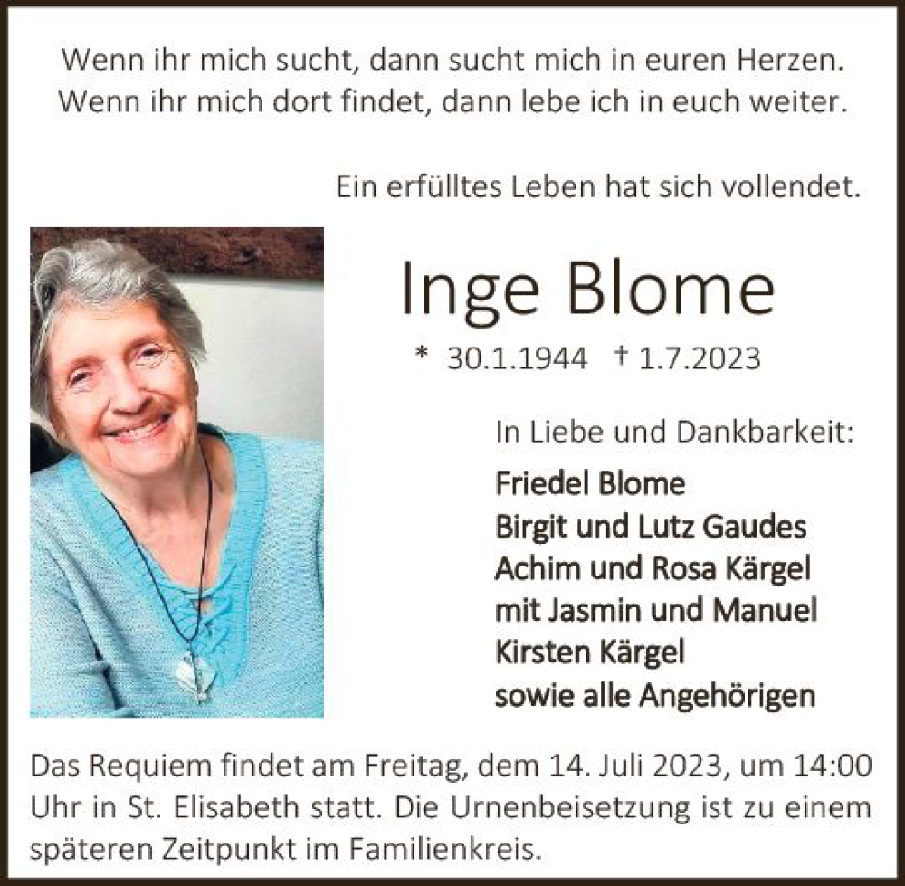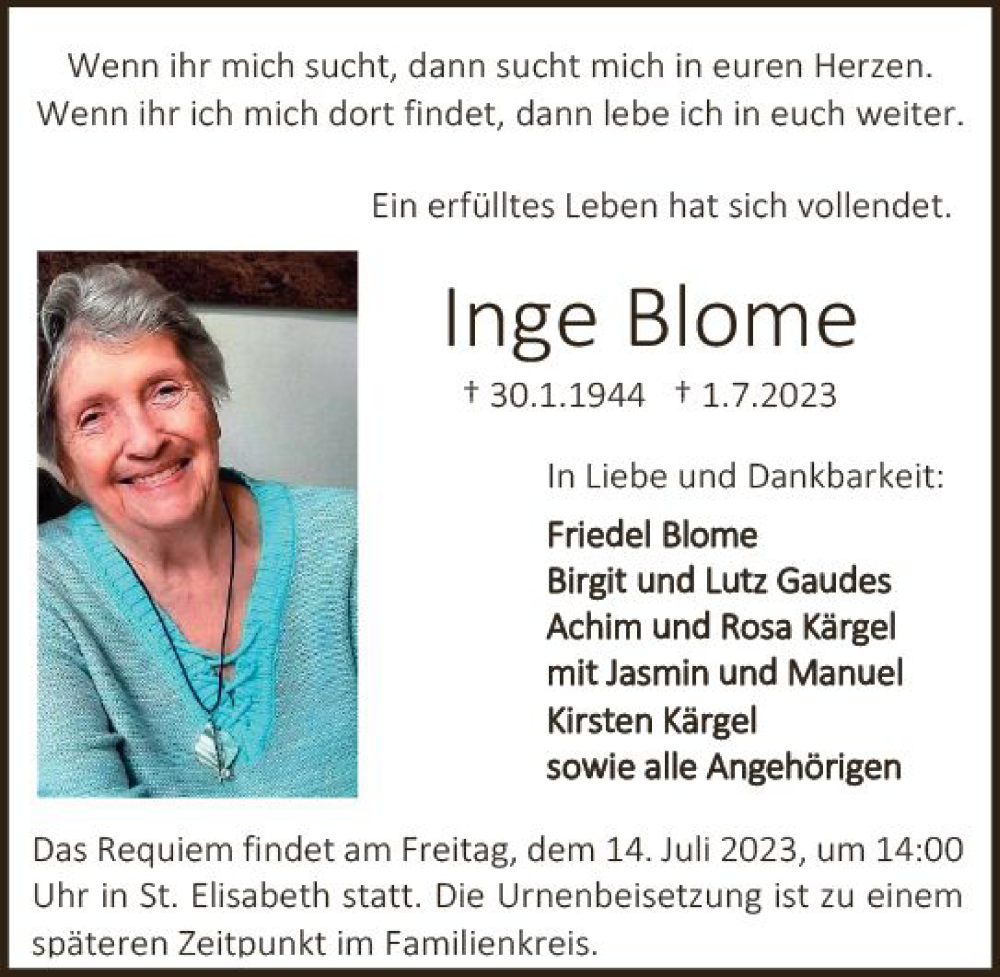 Hier finden Sie alle Traueranzeigen aus der Zeitung, die bisher für Inge Blome erschienen sind. Weitere Traueranzeigen, die in der Zeitung erscheinen, werden hier ebenfalls aufgelistet