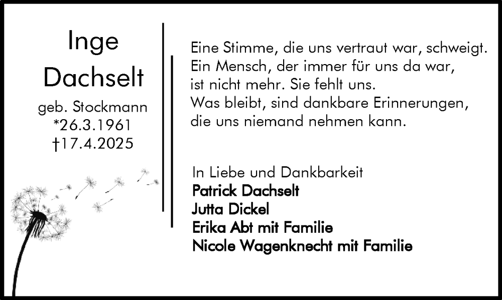 Hier finden Sie alle Traueranzeigen aus der Zeitung, die bisher für Inge Dachselt erschienen sind. Weitere Traueranzeigen, die in der Zeitung erscheinen, werden hier ebenfalls aufgelistet