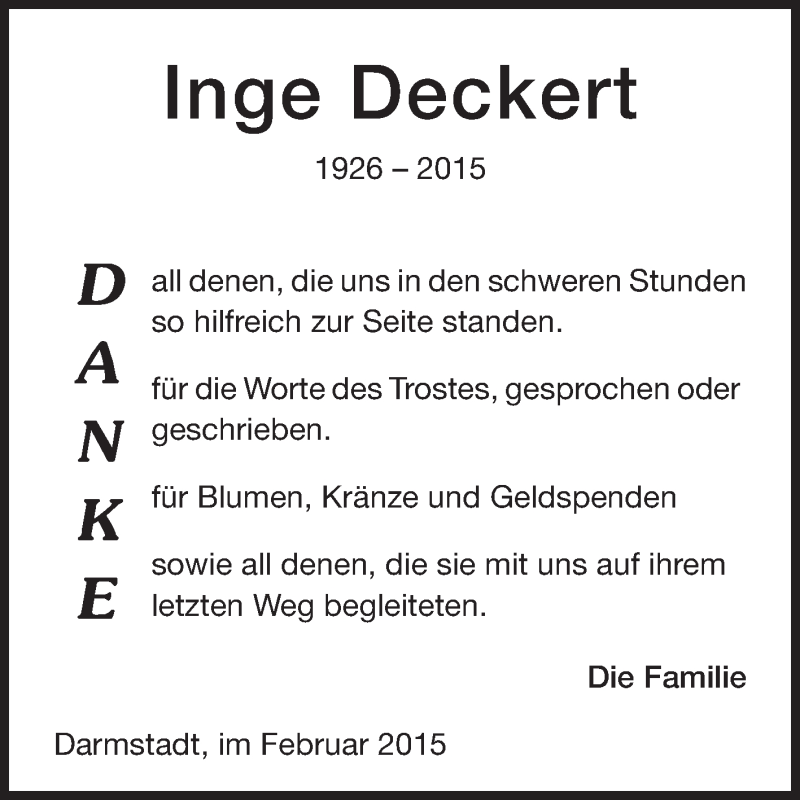 Hier finden Sie alle Traueranzeigen aus der Zeitung, die bisher für Inge Deckert erschienen sind. Weitere Traueranzeigen, die in der Zeitung erscheinen, werden hier ebenfalls aufgelistet