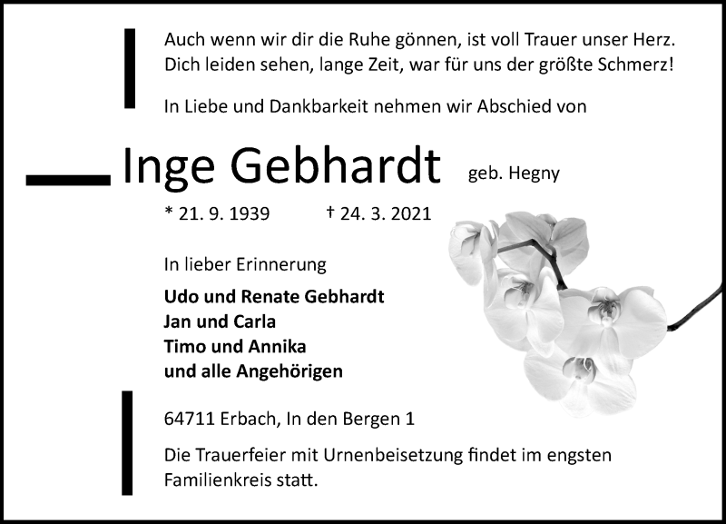 Hier finden Sie alle Traueranzeigen aus der Zeitung, die bisher für Inge Gebhardt erschienen sind. Weitere Traueranzeigen, die in der Zeitung erscheinen, werden hier ebenfalls aufgelistet