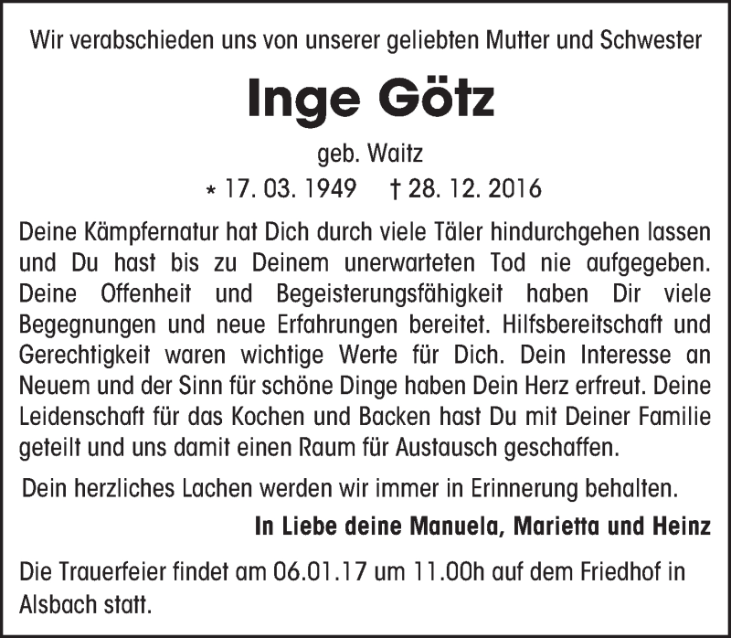 Hier finden Sie alle Traueranzeigen aus der Zeitung, die bisher für Inge Götz erschienen sind. Weitere Traueranzeigen, die in der Zeitung erscheinen, werden hier ebenfalls aufgelistet